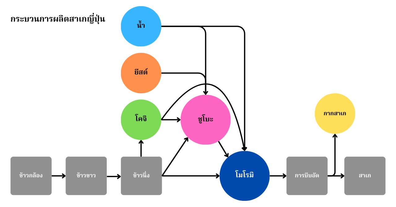 เราจะสร้างน้ำตาลจากข้าวที่เป็นวัตถุดิบของสาเกได้อย่างไร? ในข้าวแทบไม่มีน้ำตาลเลย แต่กลับมีแป้งในปริมาณสูง แป้งนี้เปรียบเสมือนกลุ่มก้อนที่ประกอบด้วยหน่วยกลูโคสหลายหมื่นหน่วยที่เชื่อมต่อกัน ซึ่งในรูปแบบนี้ไม่สามารถนำไปใช้ในการหมักแอลกอฮอล์ได้ ดังนั้น ก้อนแป้งนี้จึงต้องถูกย่อยสลายและเปลี่ยนให้เป็นกลูโคส