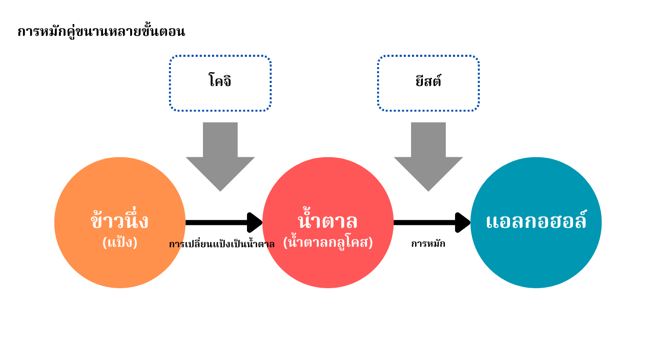 การทำงานของโคจิคิน (Koji-kin) จะเปลี่ยนแป้งในข้าวให้เป็นกลูโคส ขั้นตอนต่อไปเป็นบทบาทของจุลินทรีย์ที่เรียกว่า ยีสต์ (Yeast) ซึ่งจะเปลี่ยนกลูโคสนี้ให้เป็นแอลกอฮอล์ โดยยีสต์จะกินกลูโคสและผลิตแอลกอฮอล์ออกมาพร้อมกับก๊าซคาร์บอนไดออกไซด์ กระบวนการนี้เรียกว่า การหมักแอลกอฮอล์